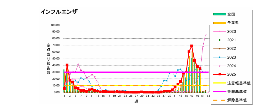 船橋市が公表している感染症発生動向によると、2025年12月中旬時点で、インフルエンザは減少傾向にあるものの、引き続き「警報レベル」で流行しています。
