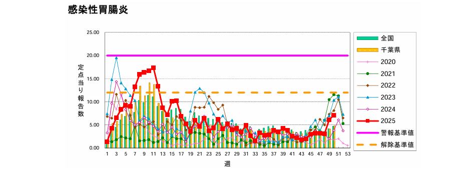 船橋市の直近のデータ(2025年第50週:12月8日~12月14日)でも、報告数が前週より増加しており、引き続き注意が必要です。