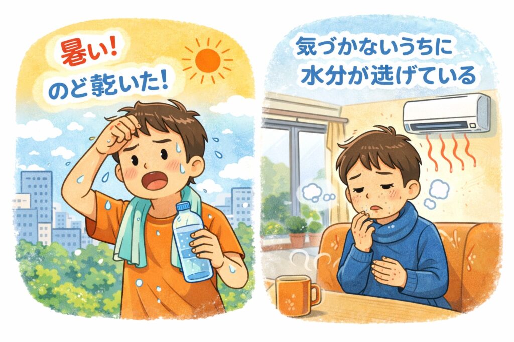 実は、冬は空気が乾燥しているうえに、暖房の効いた室内では知らず知らずのうちに体から水分が失われています。さらに寒いと「喉の渇き」を感じにくくなるため、水分補給がつい後回しになりがちです。