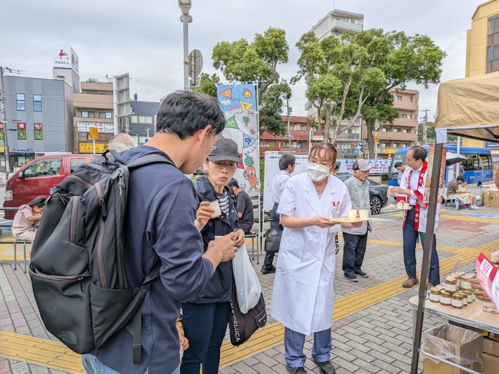 このマルシェは、地元商店会と連携しながら地域を盛り上げるイベントです。薬局としては、調剤以外の健康サポート機能を知っていただく良い機会と捉え、職員全員で参加しました。